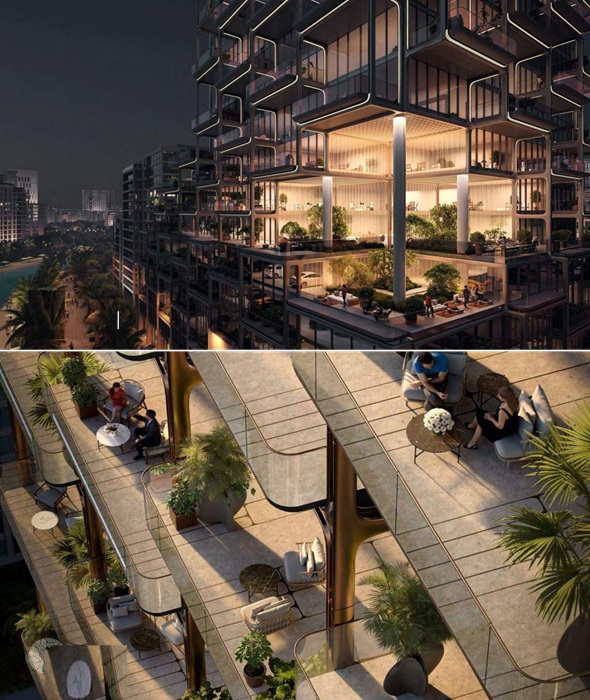 •이 프로젝트의 주요 하이라이트는 수직 조경이다. 직조된 외피의 기하학적 구조는 각 아파트마다 다양한 테라스와 개방형 생활 공간을 만들 수 있게