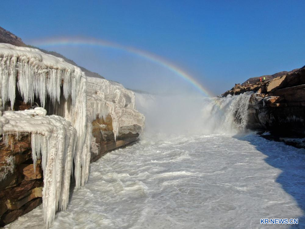 31.산시(山西)성 지(吉)현과 산시(陝西)성 이촨(宜川)현의 경계에 있는 황허(黃河) 후커우(壺口) 폭포 관광지에 걸린 무지개