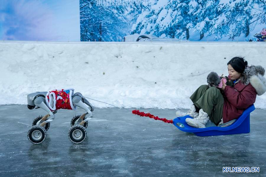 23.하얼빈 쑹화(松花)강 빙설 카니발 단지를 찾은 관광객이 로봇 썰매를 타고 있다