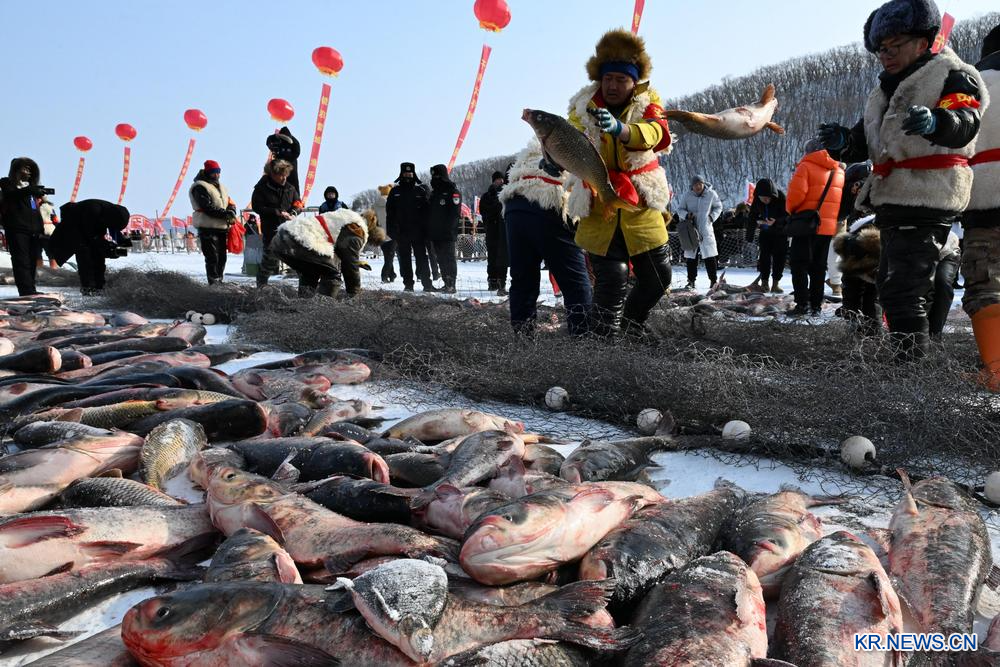34.겨울 고기잡이 축제가 15일 헤이룽장(黑龍江)성 무단장(牡丹江)시 징포후(鏡泊湖)에서 열려