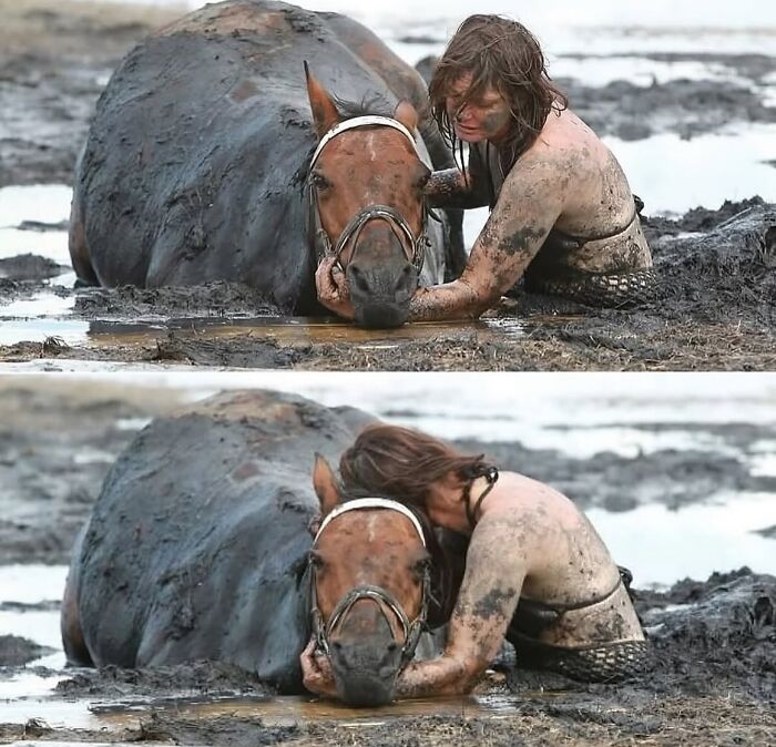 그녀는 구조대가 도착해 말을 안전하게 구해낼 때까지 생명을 지켰다.