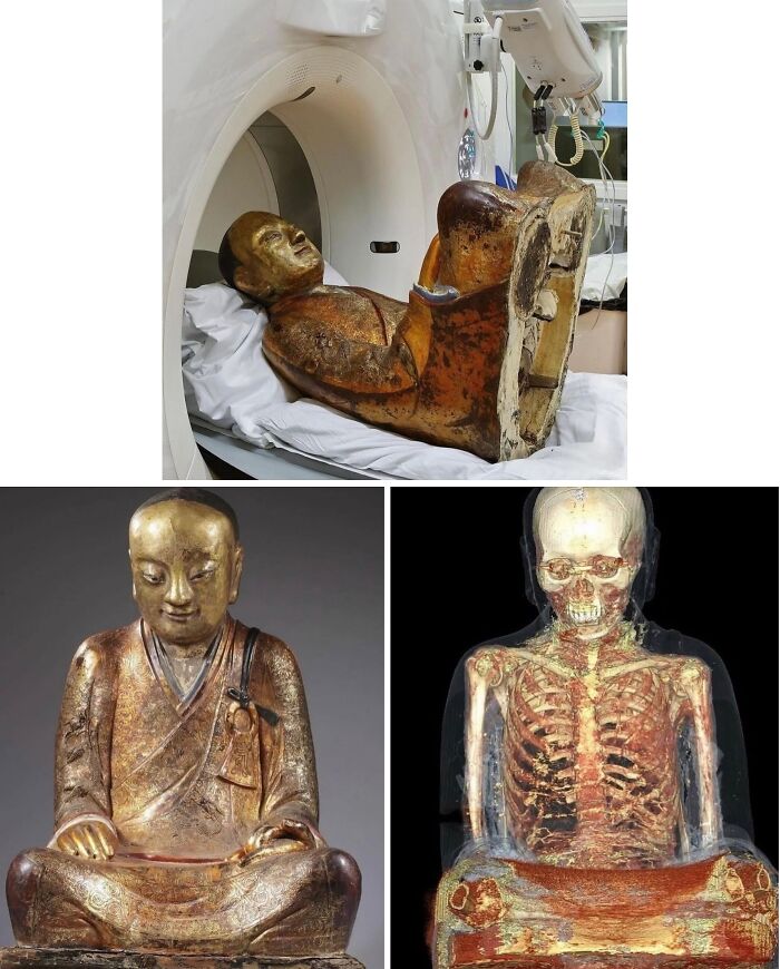 천년 된 미이라화된 승려가 고대 불상 안에 숨겨진 채로 발견되었다. 전문가들은 한 개인 수집가가 불상을 복원하기 위해 가져온 후 이 사실을 발견했다. 내부에서는 중국어로 쓰인 천 위에 앉아 있는 승려 리취 안의 유해가 발견되었다. 연구자들은 그가 사후 세계를 준비하기 위한 희귀한 관습인 '자연 미라화'를 시도했을 가능성이 있다고 보고 있다.