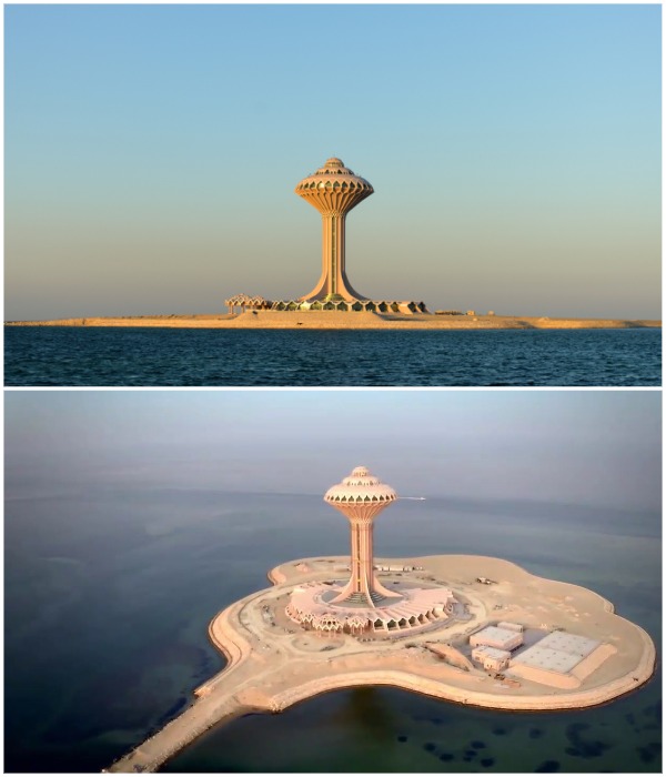 Khobar 해안가의 섬에 있는 현대식 90미터 급수탑은 20세기 후반 걸프 지역 급수 시설에서 흔히 볼 수 있는 실용적인 스타일로 설계되었다.