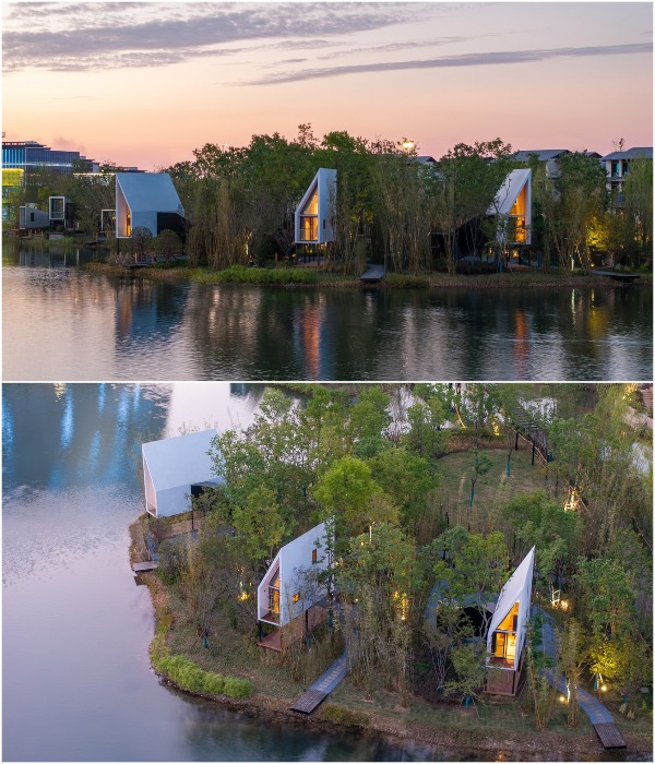 중국 후베이성의 성도(省都) 우한시 교외에 아름다운 휴양지가 문을 열었다. 이곳은 블루 강과 한(한수이)강이 만나는 '무인' 섬에서 고요함을 찾는 사람들을 위한 장소이다. 숲 바닥 위로 솟아 있는 초슬림 돛 모양의 오두막들은 급진적인 미니멀리즘, 조립식 건축의 장점, 환경적 책임을 구현하며, 잊지 못할 모험과 자연과의 완전한 재연결을 제공한다.