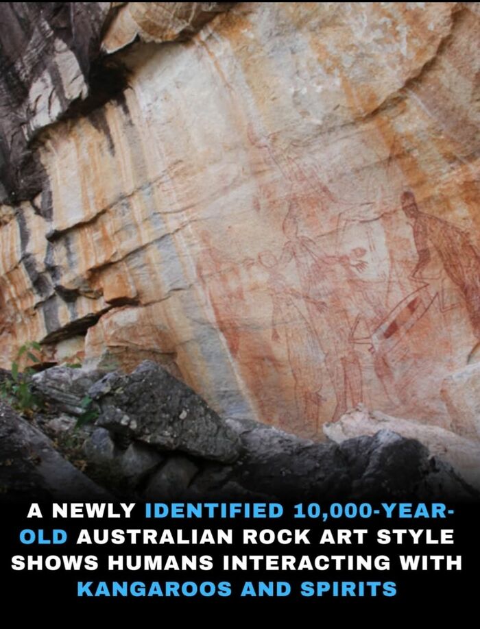 32.새롭게 확인된 1만 년 된 호주 암각화 양식은 인간이 캥거루 및 정령과 교감하는 모습을 보여준다.