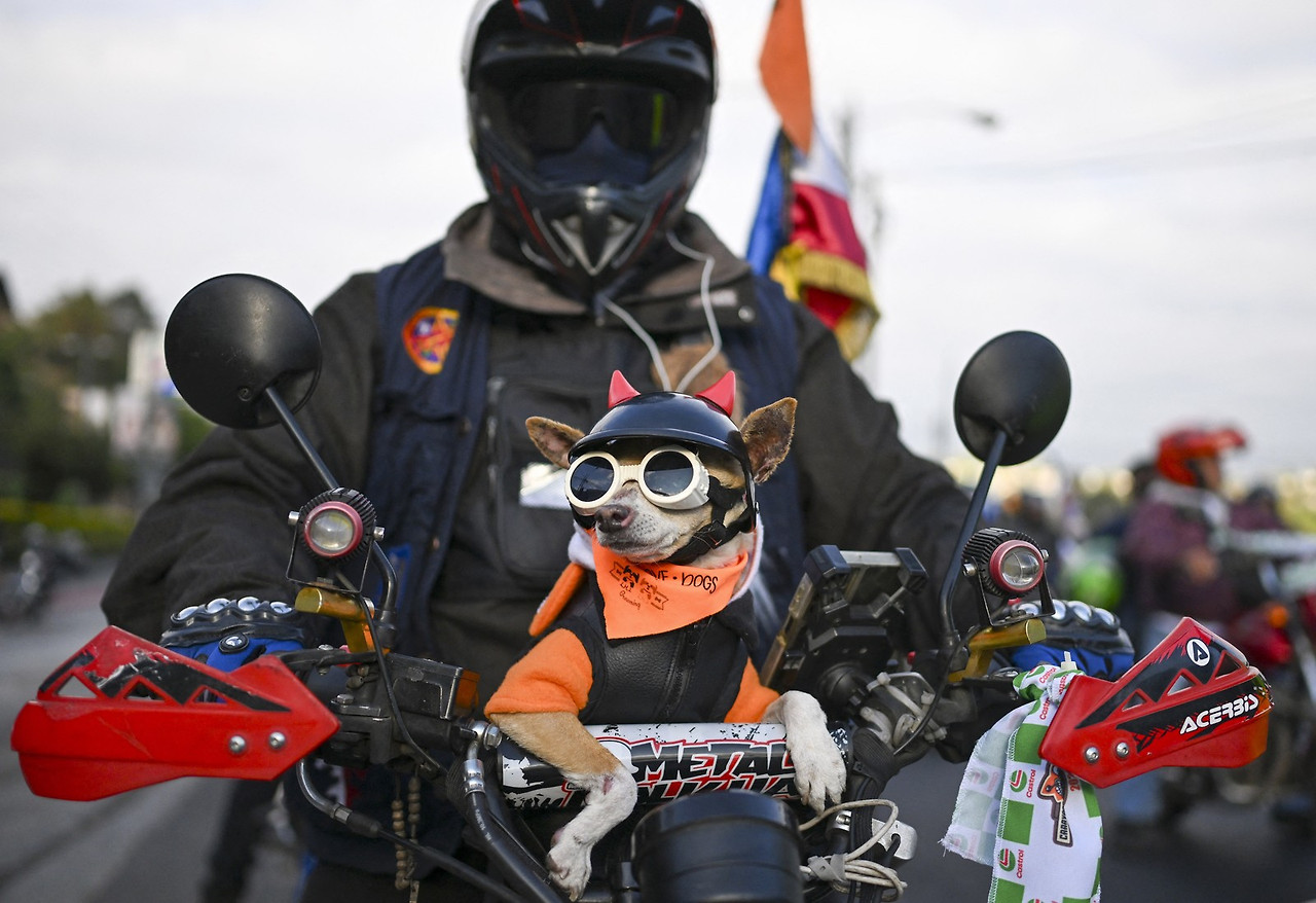 21. 한 오토바이 운전자와 그의 개가 2026년 2월 7일 과테말라시티 헌법광장에서 에스키푸라스까지 ‘카라바나 델 소로조(여우의 행렬)’ 행사에 참여하여 흑인 그리스도 상을 보러 간다. 수천 명의 오토바이 운전자들이 이 65년 전통의 순례에 참여하여 에스키푸라스의 대성당에 있는 16세기 조각된