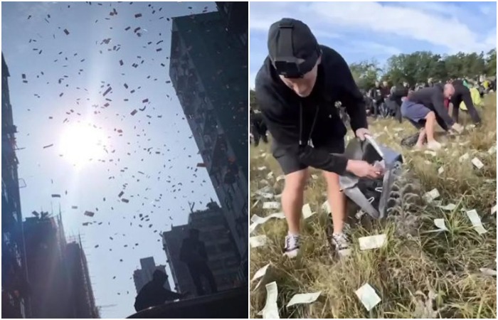 1달러 지폐를 그들 위로 떨어뜨렸다. 사람들은 손과 가방, 심지어 우산까지 사용하며 가능한 한 많은 돈을 잡으려고 필드를 뛰어다녔다.