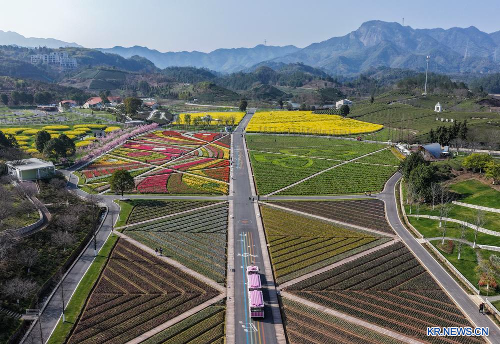 12.쓰촨(四川)성 난충(南充)시 펑안(蓬安)현에서 유람선을 타고 꽃구경을 하고 있는 관광객들
