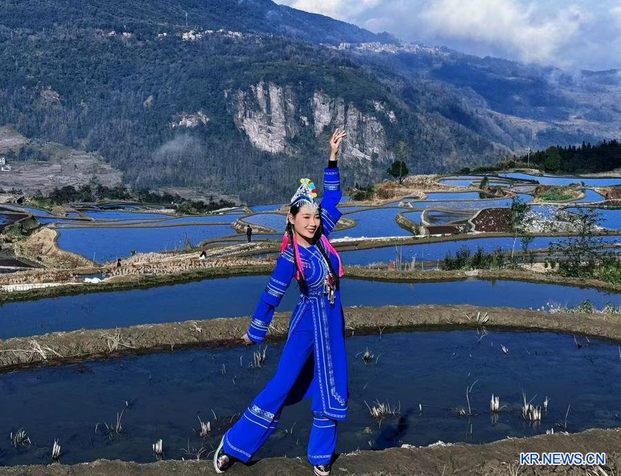 29.윈난(雲南)성 하니(哈尼) 계단식 논. 전국 정협 위원인 하니족 청년 양위니(楊鈺尼)가 팔을 뻗어 회전하고 뛰어오르며 오래된 농경의 지혜를 몸짓으로 풀어낸다.
