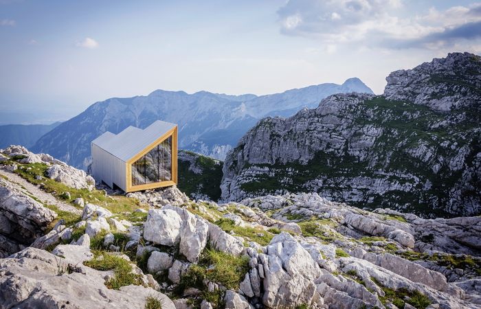 이 12㎡에 불과한 소형 대피소는 Zgornje Jezersko 근처 Kamnik-Savinja 알프스의 바위 능선 바로 위에 위치해 있다. 놀랍게도 이 구조물은 이미